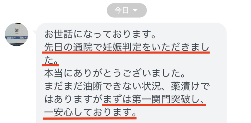 妊娠報告「先日の通院で妊娠判定をいただきました。」「まずは第一関門突破し、一安心しております。」