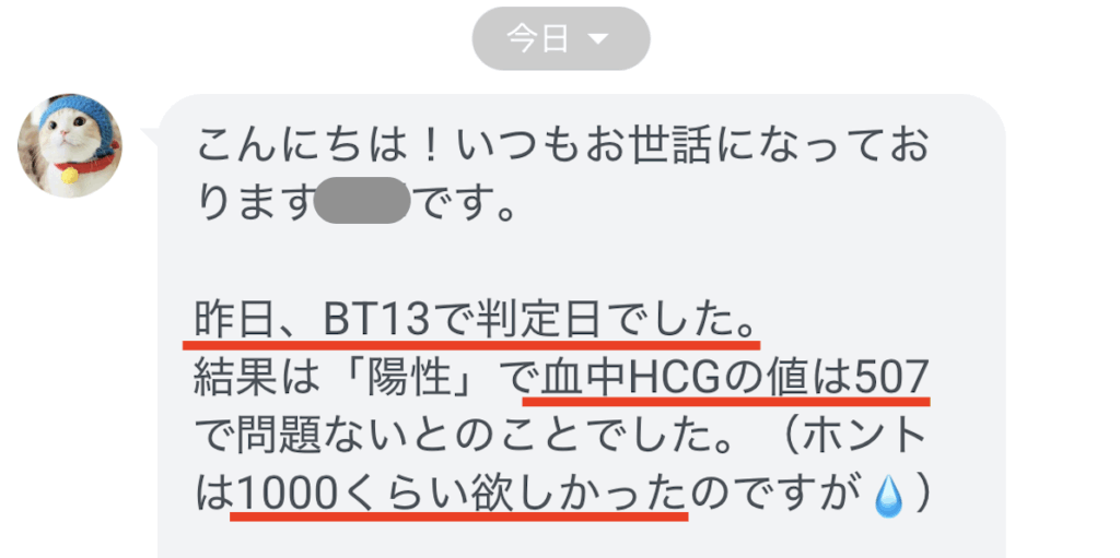 妊娠報告 稽留流産後の胚移植で「血中HCGの値は507で問題ないとのことでした。」