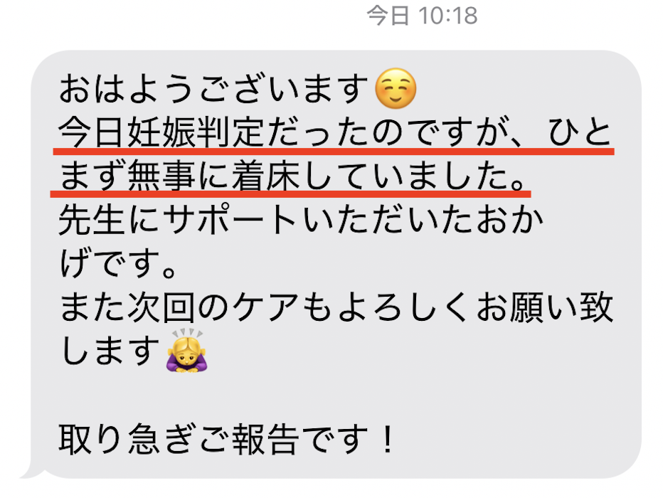 「今日妊娠判定だったのですが、ひとまず無事に着床していました。」