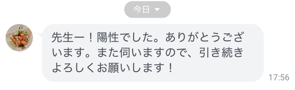 妊娠報告「先生ー!陽性でした。ありがとうございます。」