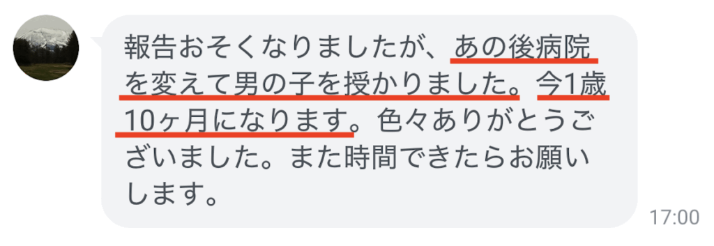 「あの後、病院を変えて男の子を授かりました。今1歳10ヶ月になります。」