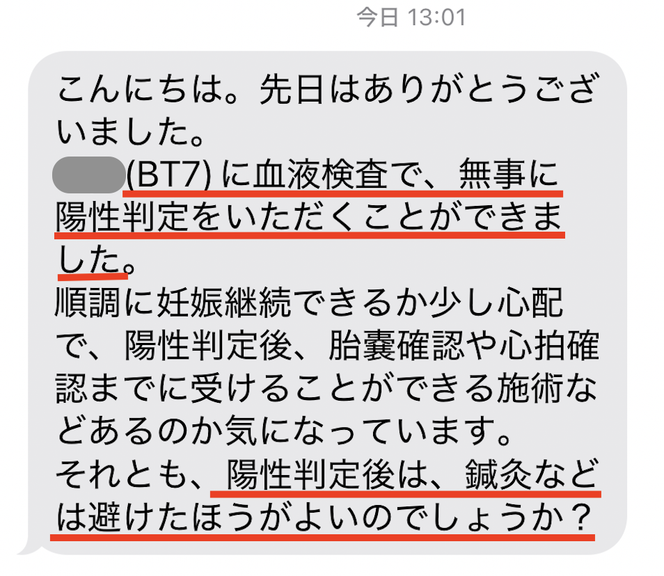 妊娠報告「(BT7)に血液検査で、無事に陽性判定をいただくことができました。」
