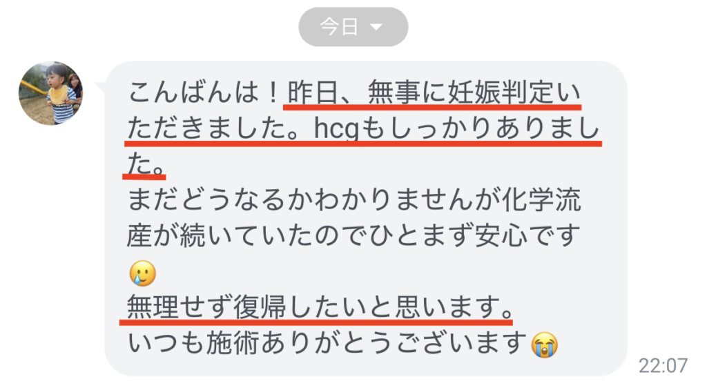 「昨日、無事に妊娠判定いただきました。hcgもしっかりありました。」